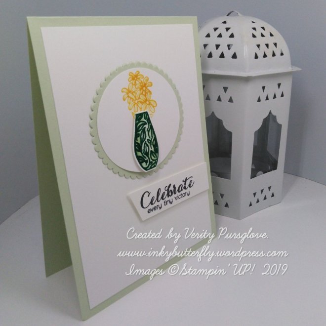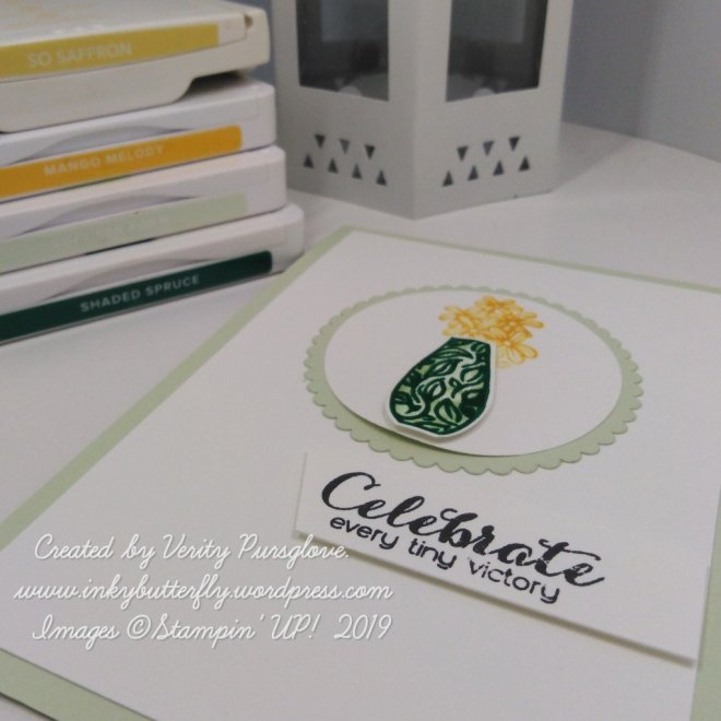 The Vase was stamped separately and punched out the the coordinating punch. This was added to the topper with dimensionals…. I think I might be addicted to dimensionals.